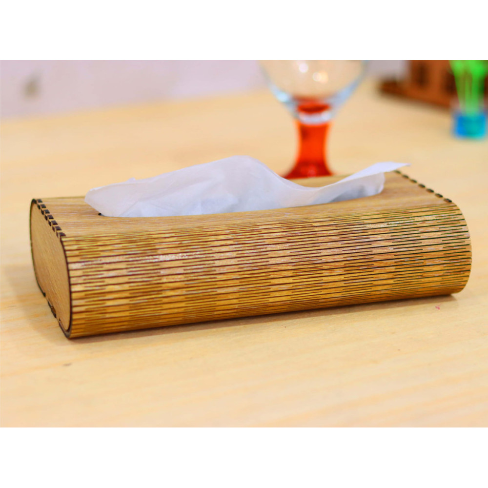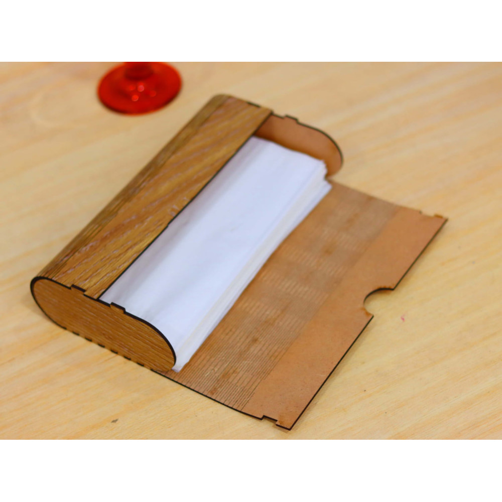 Krásnyn fa szalvétatartóját metszet díszíti. A végső felület lehet színes vagy természetes. A papírzsebkendőket az alsó rész megnyomása után helyezzük be.