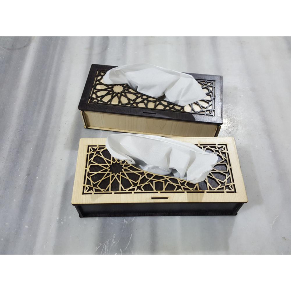 Krásnyn fa szalvétatartóját metszet díszíti. A végső felület lehet színes vagy természetes. A papírzsebkendőket az alsó rész megnyomása után helyezzük be.