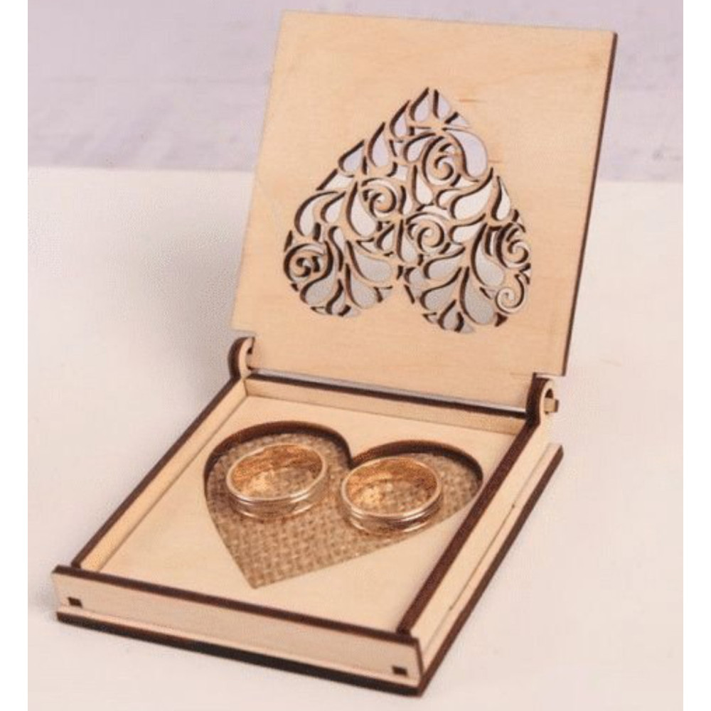 Krabička na obrúčky v tvare kocky je vyrezávaná zo 3 mm preglejky. Text je gravírovaný. Celá krabička na prstene je naturálna.